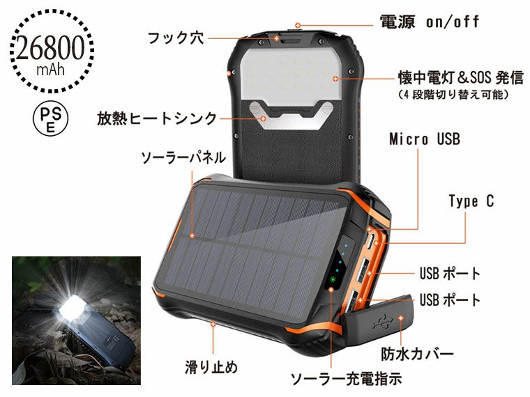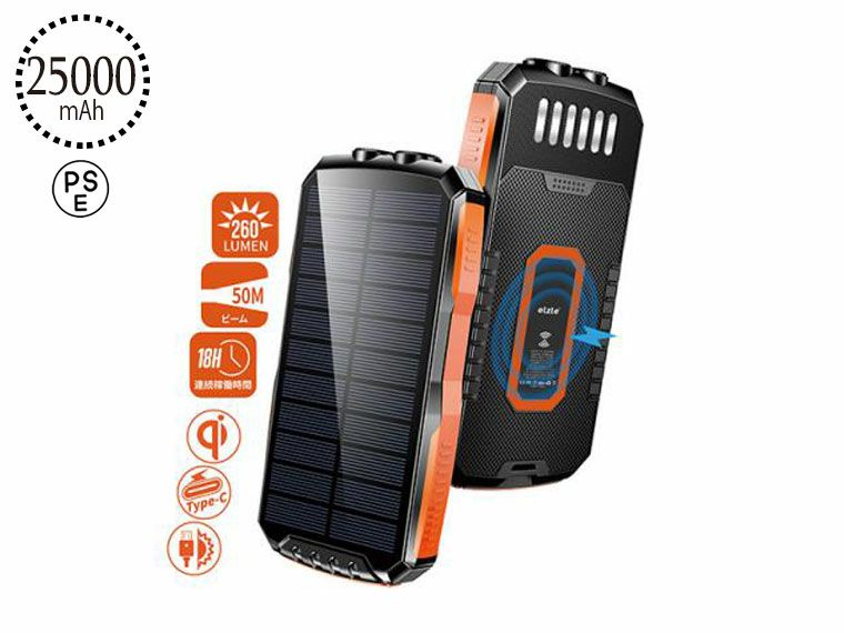 太陽光でも充電できるモバイルバッテリーです。陽の光さえあればいつでもどこでも充電できるので、災害時用として防災バッグに入れておきたいアイテムです。キャンプ時や登山時などに充電したい方にもおすすめです。環境に優しく、電気代もかからないのでお財布にも優しいのが嬉しいポイント。