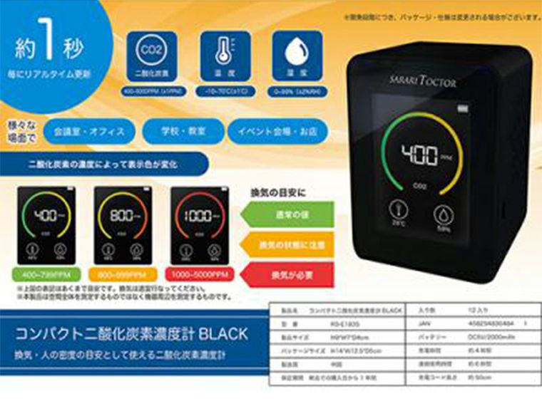 | 備考1 | バッテリー容量:2000mAh 電圧:DC5V 二酸化炭素濃度測定範囲:400~5000PPM 湿度測定範囲:0~99% 温度測定範囲:-10~40℃ ※ケース割れ出荷をご希望のお客様はお問い合わせください。 |